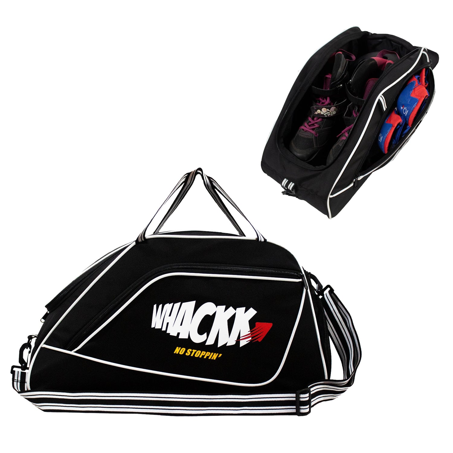 Roller skating is a recreational and competitive sport commonly known as so ‰ÛÒ called extreme sports. It is a sport which is presented very creatively on streets. Such a sport deserves a creative bag too. Whackk presents you ‰ÛÏFLIP ‰ÛÏ. An innovative bag specially designed for skating after studying all the aspects of the sport. It has a huge main compartment for a pair of skates and helmet. In the front it has a specialized pocket for all the protection pads and on the side, it has two mesh bottle holders and a small zipper pocket for miscellaneous items. It has a durable padded base for support and can be carried dual ways ‰ÛÒ from the hand-held straps or on shoulder with the shoulder strap. It comes with a detachable shoulder strap to remove when no in need.